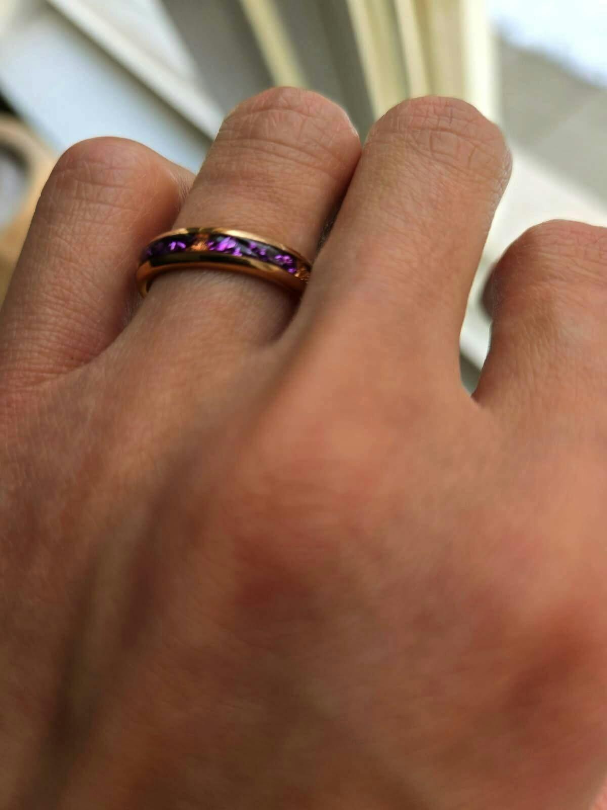 This 4mm tungsten ring features a polished rose gold tungsten color, and an inlay of lab grown amethyst gemstone.