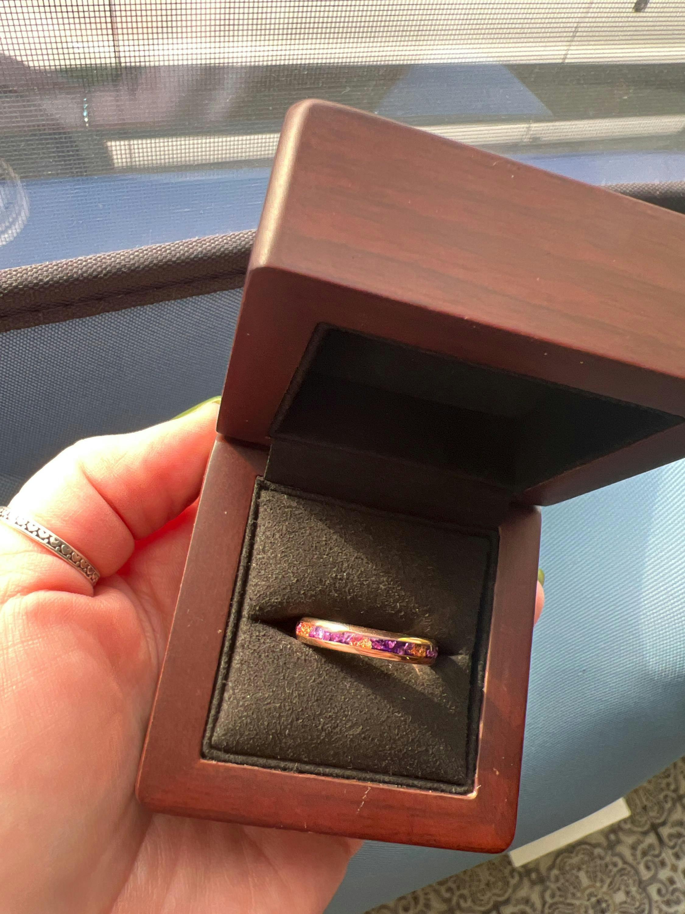 Beautiful ring! Fits perfectly. Would definitely recommend. Came super fast. All around good service.